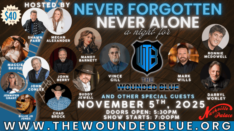 The Wounded Blue’s mid-week benefit concert, ‘Never Forgotten, Never Alone – A Night for The Wounded Blue,’ is adding star power with Vince Gill and Mandy Barnett now confirmed to perform. National media personalities Shawn Parr and Megan Alexander will co-host the evening, celebrating and supporting law enforcement officers injured or disabled in the line of duty.